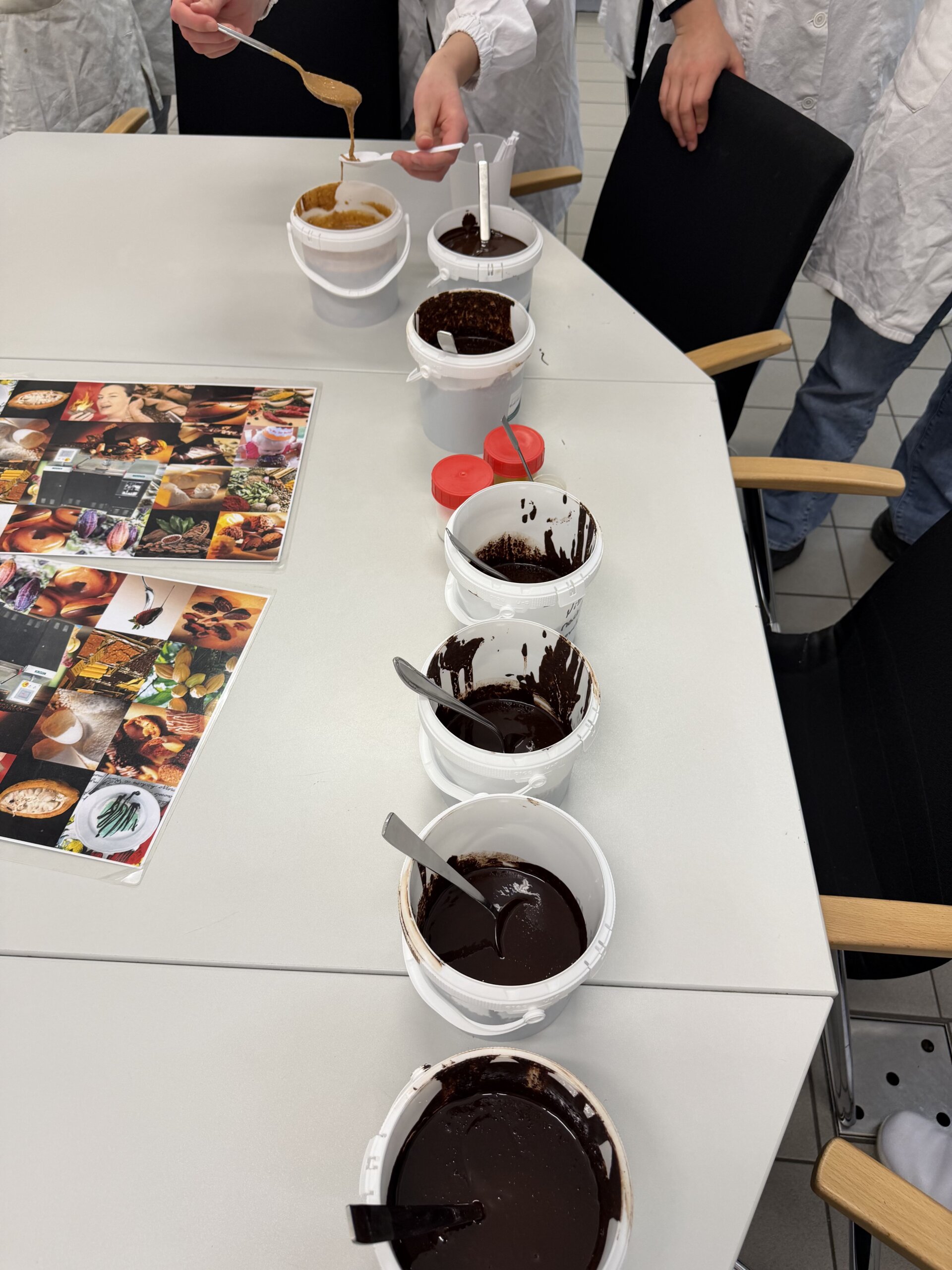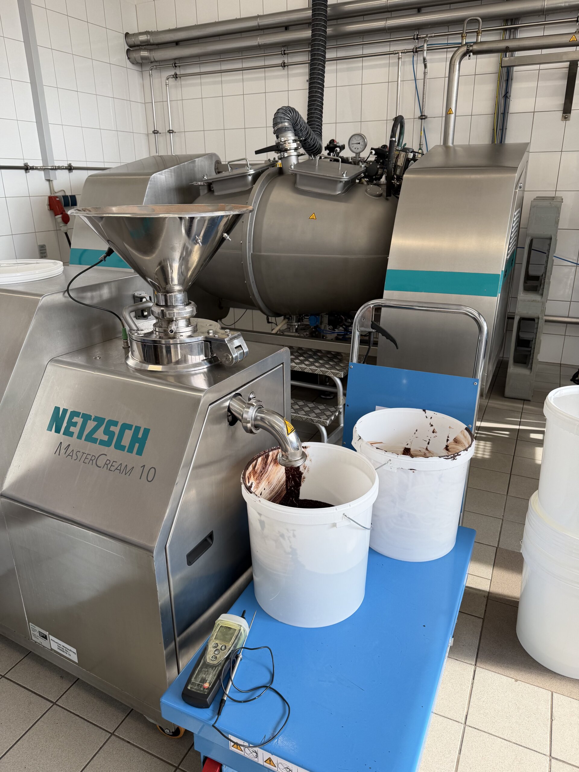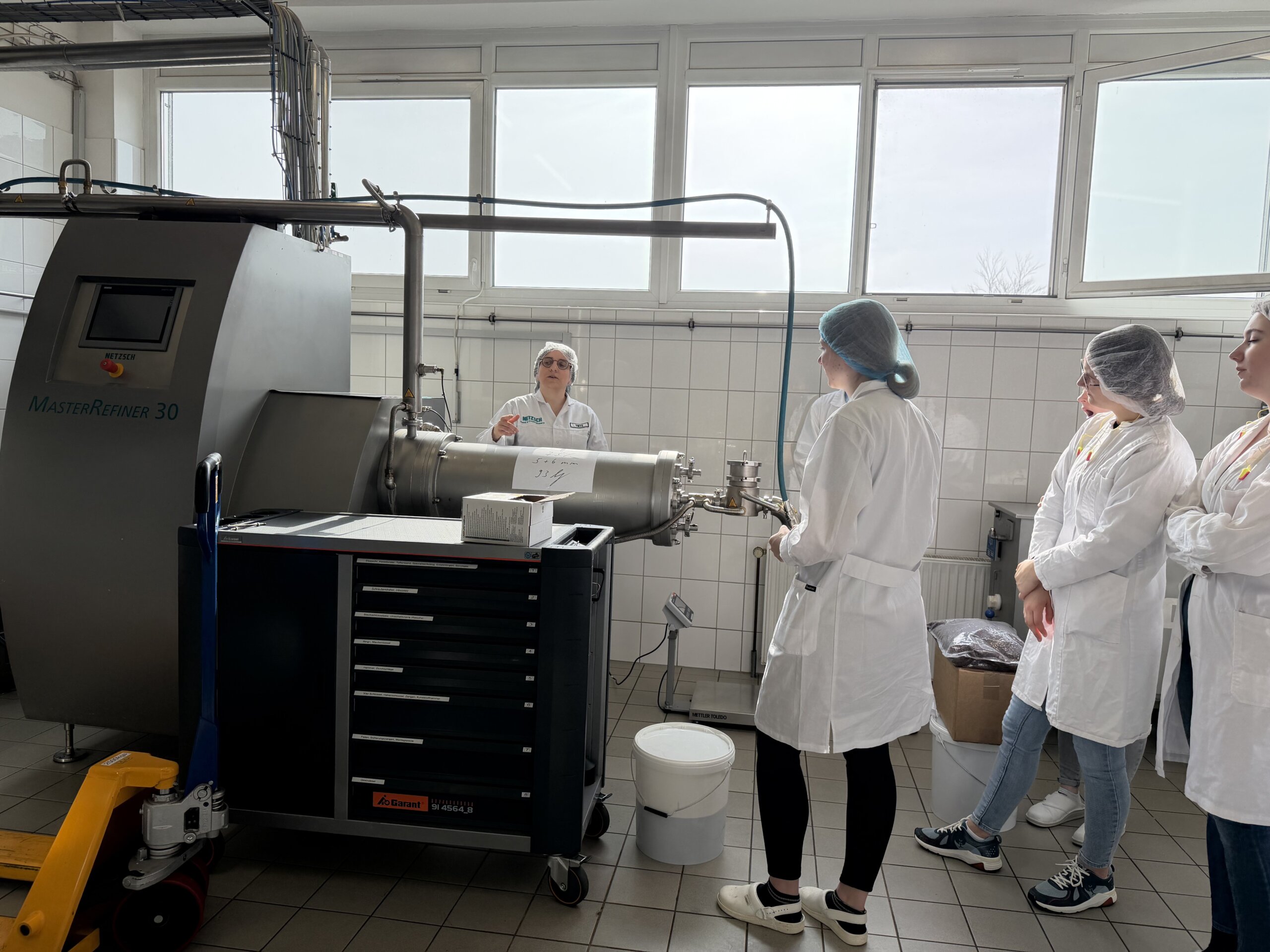 Besonders spannend war der praktische Teil im Technikum des Unternehmens: Aus angelieferten Kakaobohnen und Haselnüssen stellten die Teilnehmer selbst Schokolade, Nougat und Haselnusspasten her. Dabei arbeiteten sie mit der Anlage „Master Cream“ sowie mit einer Kombinationsanlage aus Concheur und Kugelmühle. Diese Technik ermöglicht einen anderen Zugang zur Schokoladenherstellung als klassische Verfahren. Die hergestellten Produkte wurden selbstverständlich mit nach Wels genommen – insgesamt über 100 Kilogramm Schokolade und Nougat, die nun im Rahmen des Projektunterrichts weiterverarbeitet werden. Die Kakaonibs wurden von der Firma Hofer Schokoladen in Sattledt gesponsert, vielen Dank dafür!