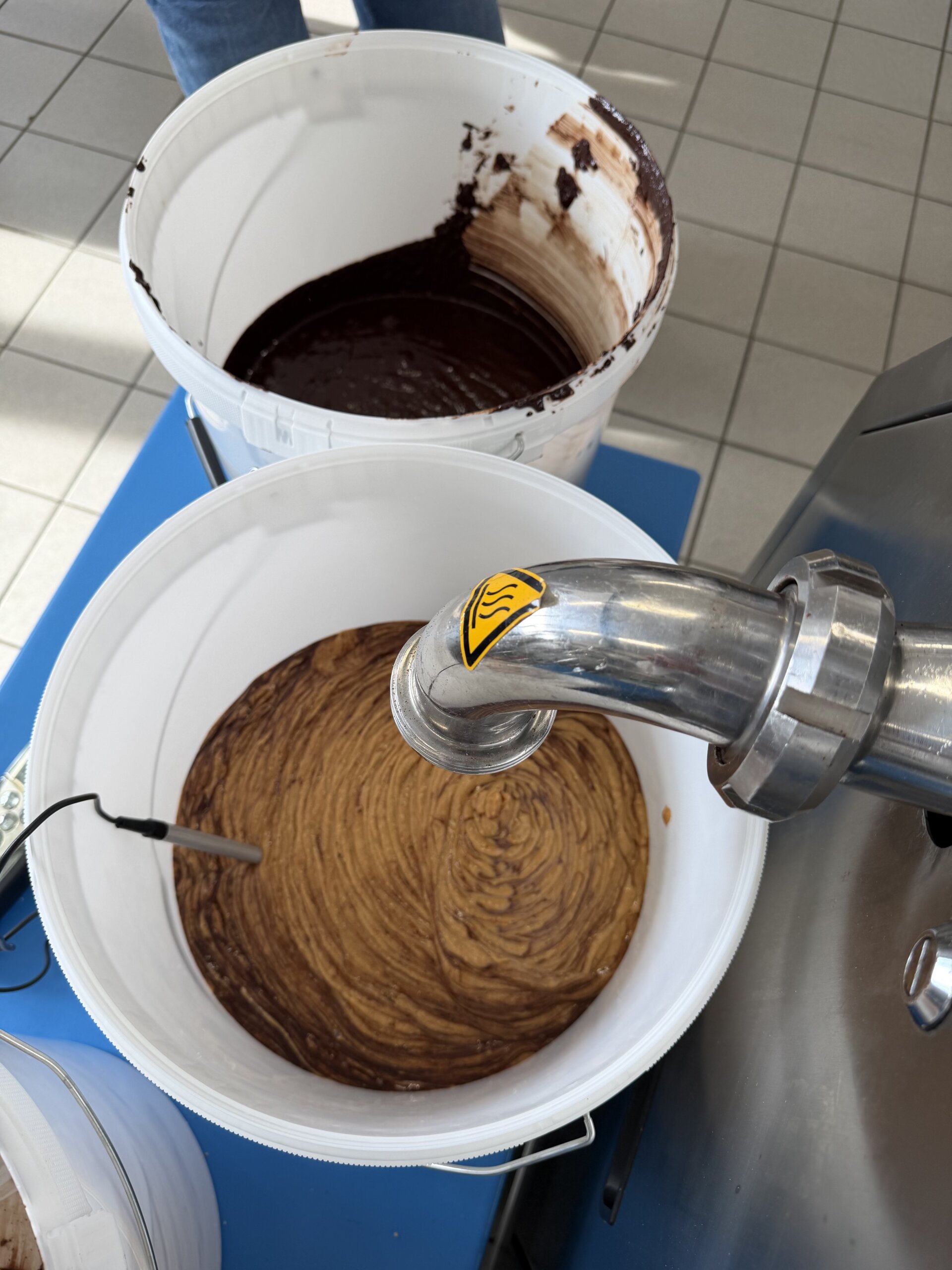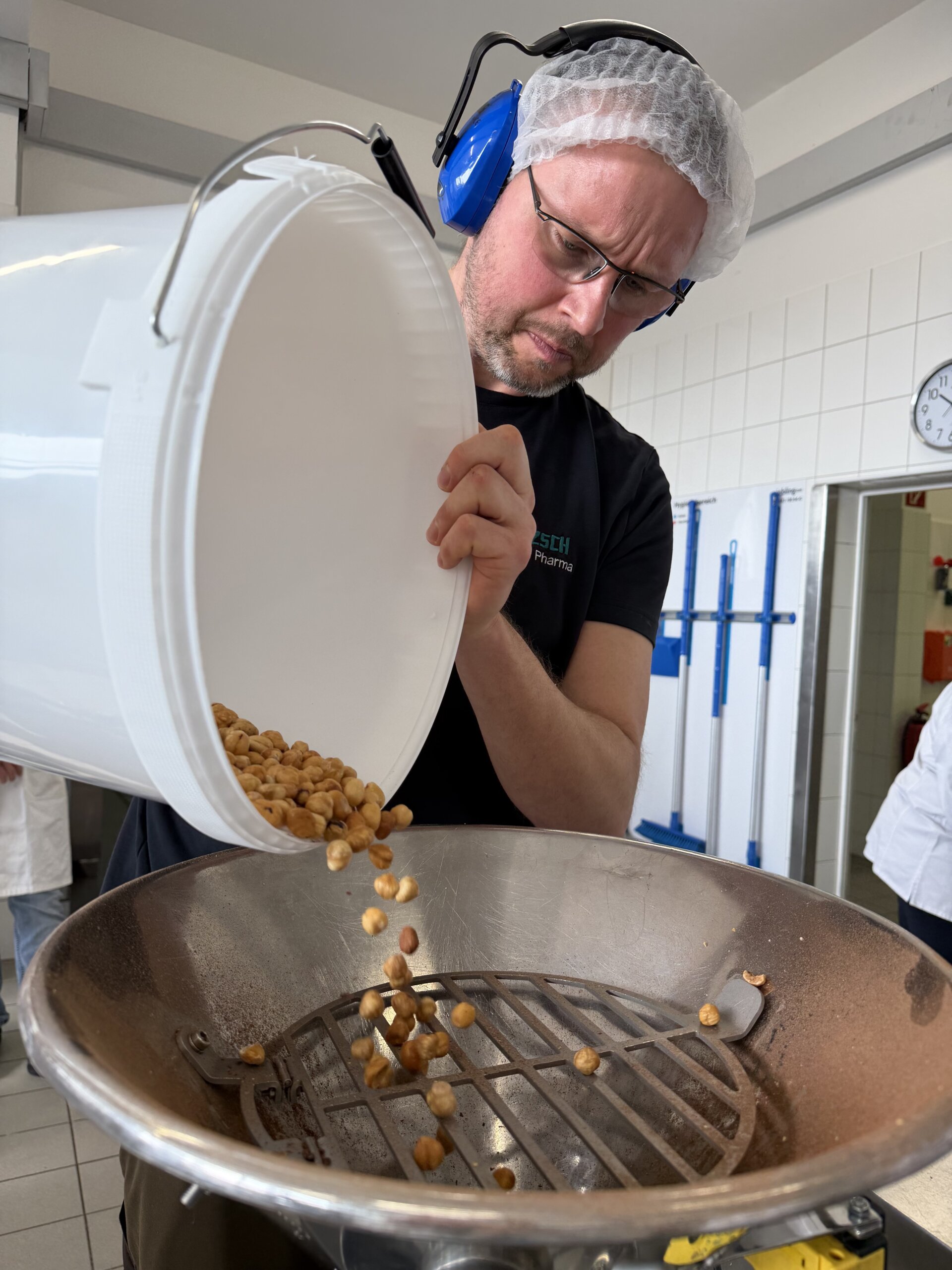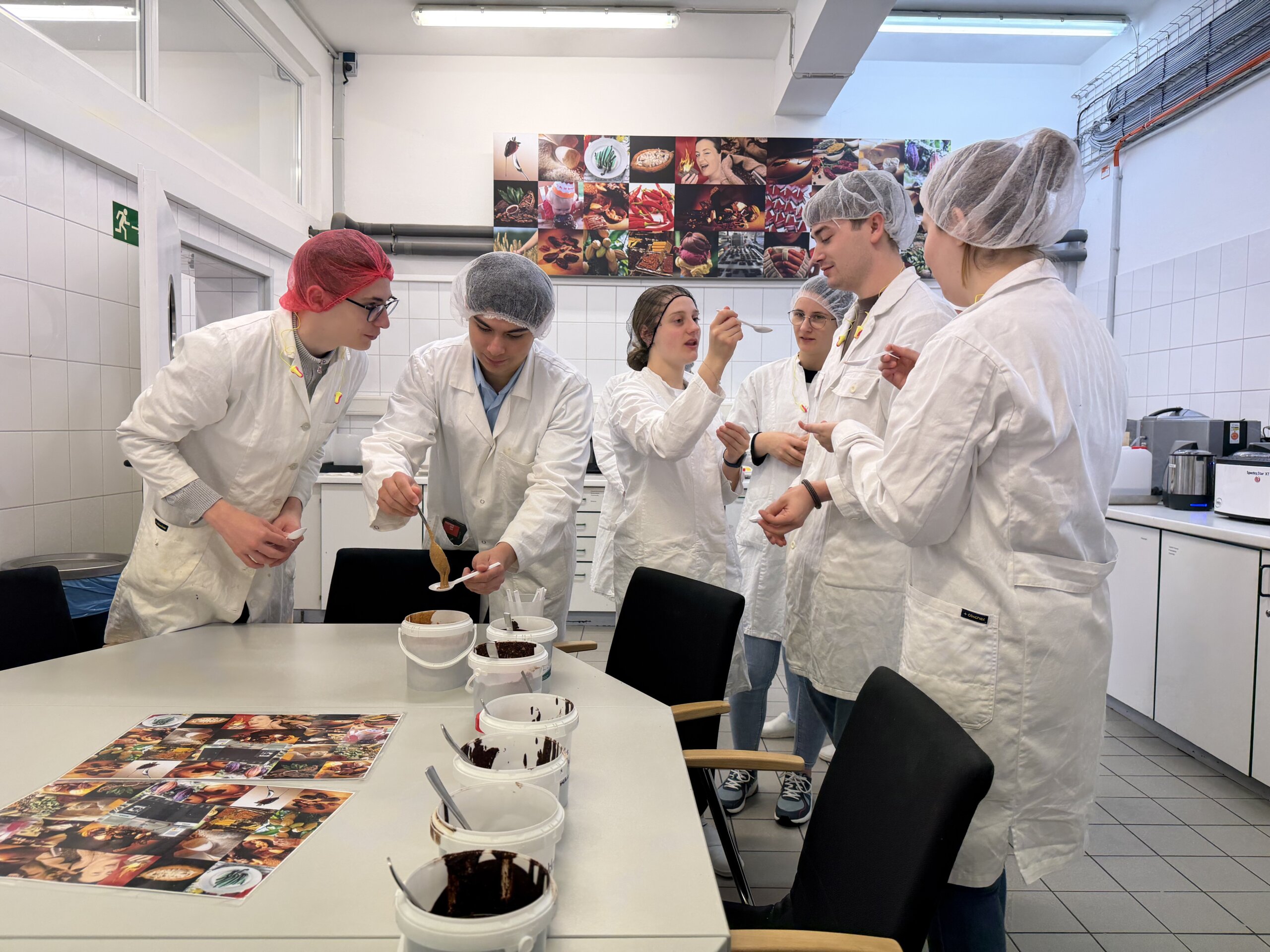 Besonders spannend war der praktische Teil im Technikum des Unternehmens: Aus angelieferten Kakaobohnen und Haselnüssen stellten die Teilnehmer selbst Schokolade, Nougat und Haselnusspasten her. Dabei arbeiteten sie mit der Anlage „Master Cream“ sowie mit einer Kombinationsanlage aus Concheur und Kugelmühle. Diese Technik ermöglicht einen anderen Zugang zur Schokoladenherstellung als klassische Verfahren. Die hergestellten Produkte wurden selbstverständlich mit nach Wels genommen – insgesamt über 100 Kilogramm Schokolade und Nougat, die nun im Rahmen des Projektunterrichts weiterverarbeitet werden. Die Kakaonibs wurden von der Firma Hofer Schokoladen in Sattledt gesponsert, vielen Dank dafür!