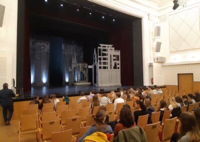 Am Vormittag besuchten die Schülerinnen und Schüler des 2. und 3. Jahrgangs im Rahmen des Deutschunterrichts das Stadttheater Wels. Die Aufführung des Theaterstücks  „Der Besuch der alten Dame“ von Friedrich Dürrenmatt dauerte insgesamt zweieinhalb Stunden und wurde durch eine zehnminütige Pause unterbrochen.